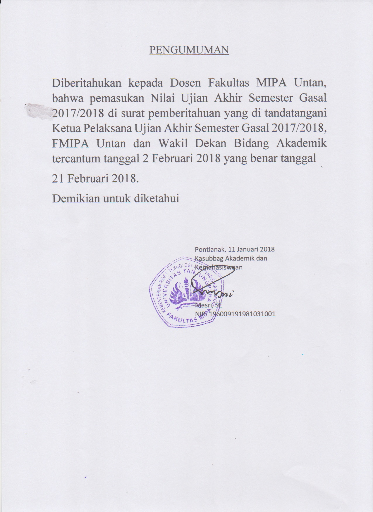 Berikut terlampir Pengumuman Pemasukan Nilai Ujian Akhir Semester Gasal 2017/2018 untuk Dosen FMIPA Untan.