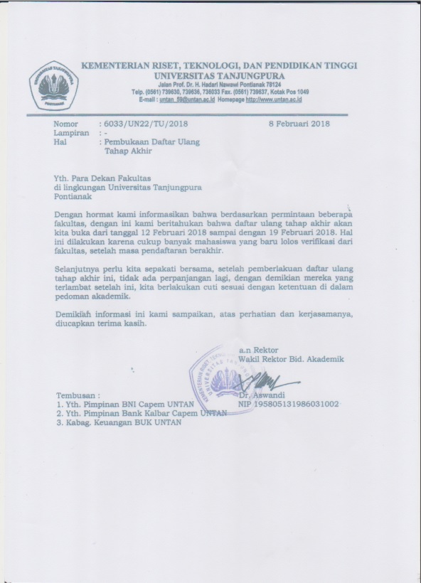 Daftar ulang tahap akhir dibuka mulai tanggal 12 Februari s/d 19 Februari 2018.