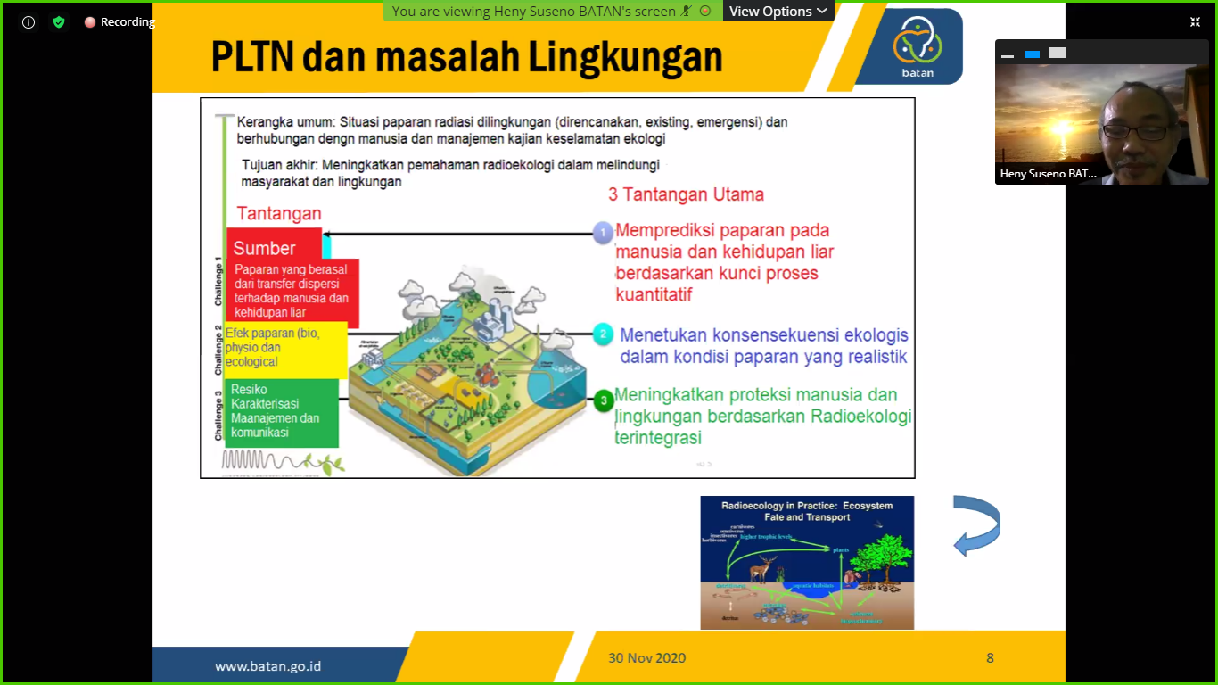 “Radioekologi bukan sekedar pemantauan lingkungan. Perlu untuk diketahui bahwa pemantauan lingkungan adalah bagian dari aktivitas radioekologi. Dalam radioekologi juga diperlukan konsensus dan proteksi lingkungan, salah satu tujuannya adalah untuk memastikan keberlangsungan komponen biotik non human lainnya,” jelasnya.