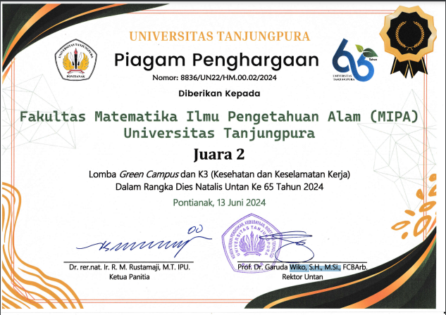 Seluruh civitas akademika Universitas Tanjungpura dengan bangga mengucapkan selamat kepada Fakultas Matematika dan Ilmu Pengetahuan Alam (FMIPA) atas prestasi gemilangnya meraih Juara II dalam Lomba Green Campus dan K3 (Kesehatan dan keselamatam Kerja) yang diselenggarakan dalam rangka Dies Natalis Universitas Tanjungpura ke-65 Tahun 2024. Keberhasilan ini tercatat dalam Piagam Nomor 8836/UN22/HM.00.02/2024, yang dikeluarkan pada tanggal 13 Juni 2024, dan ditandatangani oleh Rektor Universitas Tanjungpura, Prof. Dr. Garuda Wiko, S.H., M.Si., FCBArb., serta Wakil Rektor Pelaksana Kegiatan, Dr. rer.nat. Ir. R. M. Rustamaji, M.T., IPU.