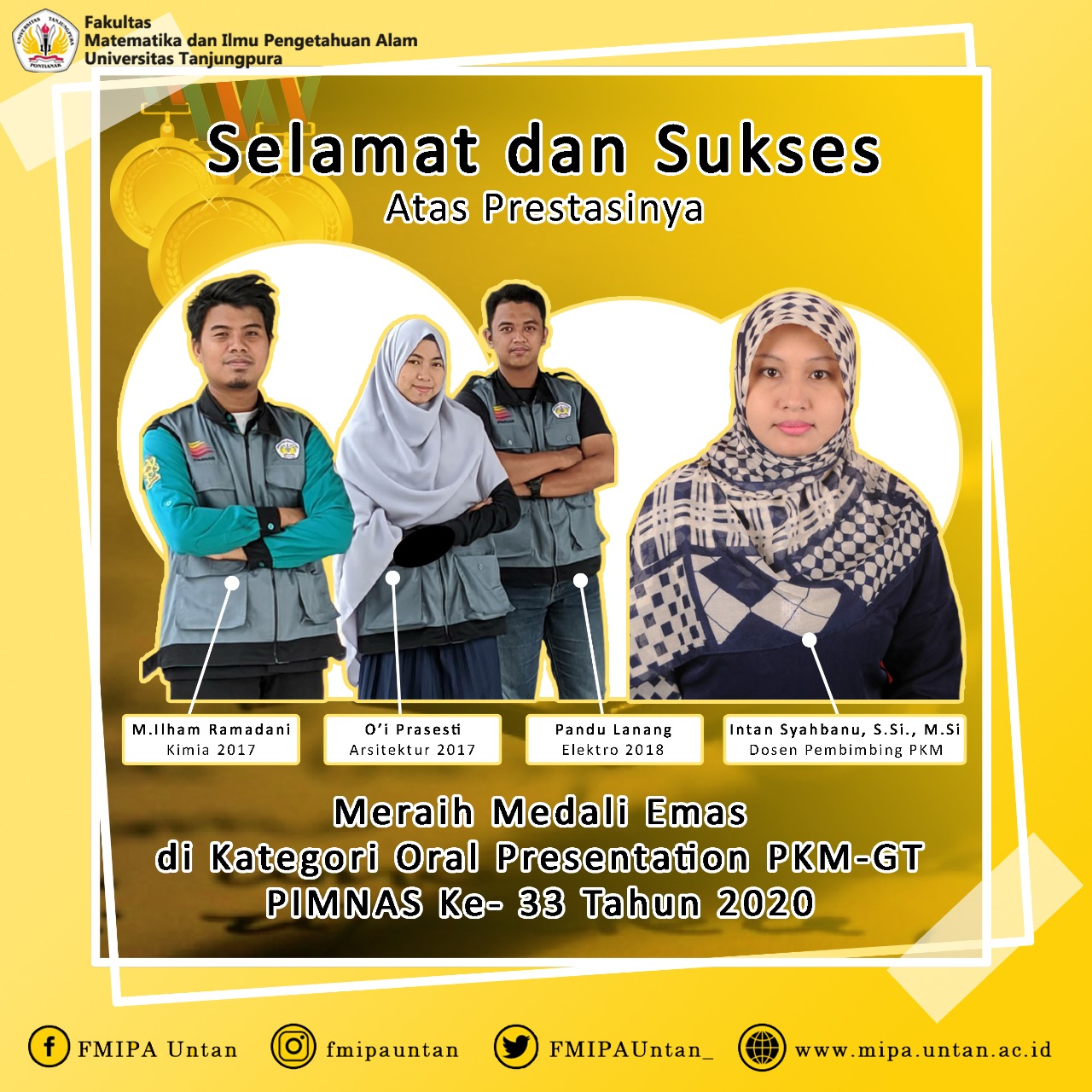 "Alhamdulillahirrabbil'alamin.. Puji Syukur kepada Allah SWT atas prestasi yang telah diraih oleh tim PKM Untan, terutama tim PKM-GT kami dengan ketua Muhammad Ilham Ramadhani darI Prodi Kimia FMIPA, dengan anggota O'i Prasesti dan Pandu Lanang Turonggo Jati dari Fakultas Teknik. Prestasi yg diraih ini selain karena kerja sama tim yang kompak, juga tidak terlepas dari dukungan fakultas dan universitas sehingga tim dapat mengukir prestasi dengan memperoleh medali emas di pentas PIMNAS 33 ini," sampai Intan.