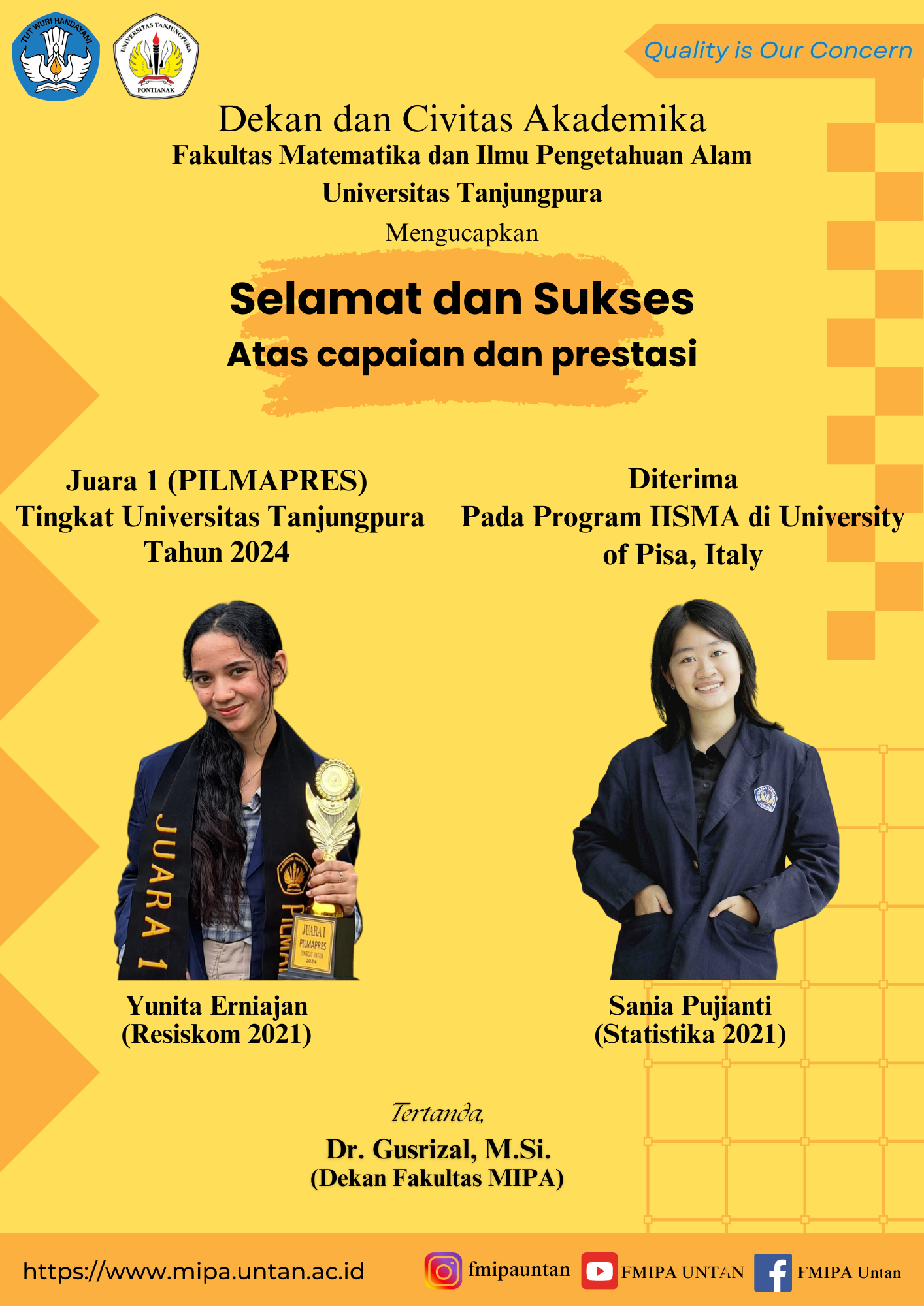 Sementara itu, Sania Pujianti, Mahasiswi Program Studi Statistika berhasil terpilih menjadi peseta IISMA (Indonesian International Student Mobility Award) Tahun 2024. Sania akan menjalani student exchange di Department of Statistic, Faculty of Mathematic & Natural Science University of Pisa, Italy. Perjalanan penuh inspirasi melalui program IISMA akan memberikan pengalaman berharga bagi Sania. Semoga diberikan kemudahan dan sukses serta terus memberikan prestasi terbaik untuk FMIPA UNTAN. Kami nantikan cerita indah dan insight nya ya.