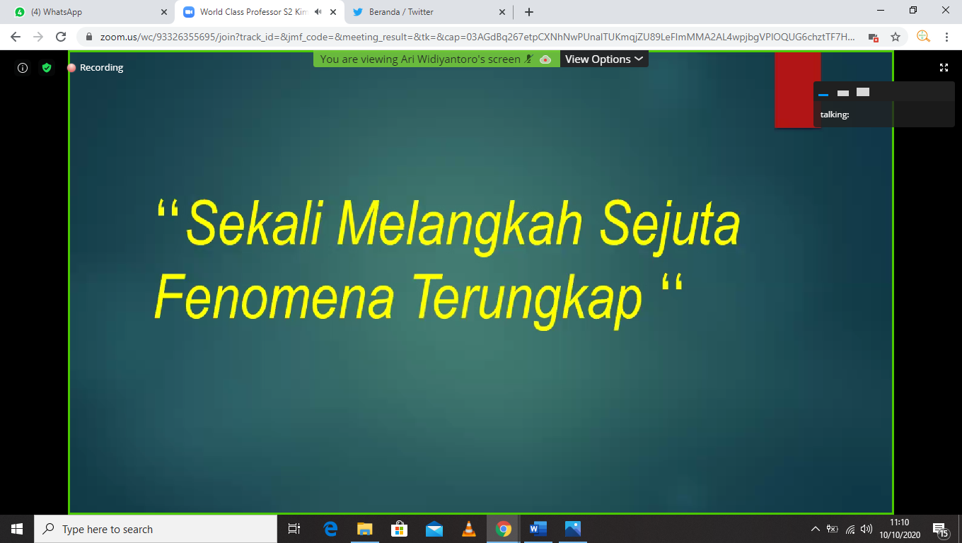 Jurusan Kimia Fakultas Matematika dan Ilmu Pengetahua Alam Universitas Tanjungpura (FMIPA Untan) kembali adakan World Class Professor Program (WCPP). Tema yang di usung dalam WCPP Scheme 2 hari ini ialah “Trend Riset Kimia”, Kamis (10/10/2020).