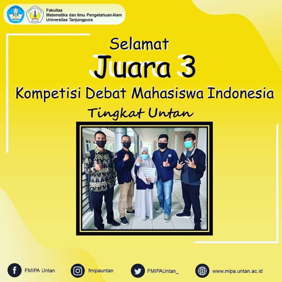 Tim Kompetisi Debat Mahasiswa Indonesia (KDMI) Fakultas Matematika dan Ilmu Pengetahuan Alam Universitas Tanjungpura (FMIPA Untan) kembali ukir prestasi, berhasil menjadi Tim Terbaik ke-3 di seleksi tingkat universitas KDMI 2021.