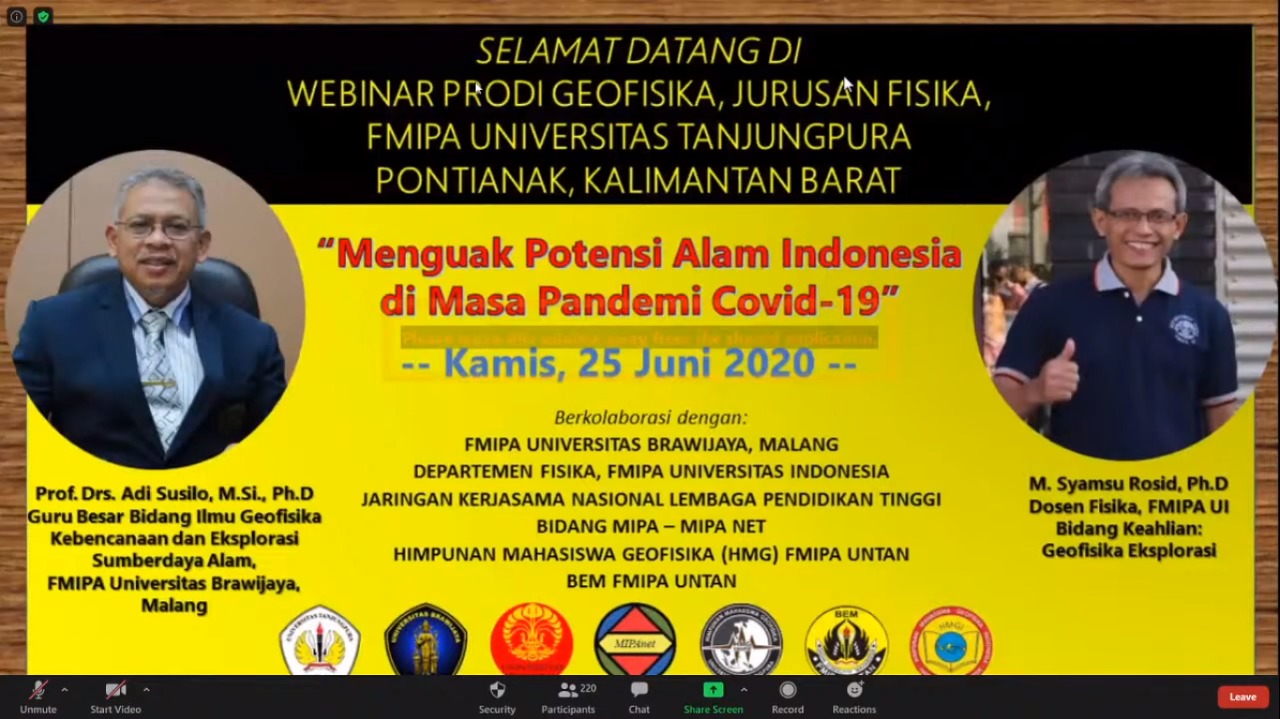 Program Studi Geofisika Fakultas Matematika dan Ilmu Pengetahuan Alam Universitas Tanjungpura (FMIPA Untan) mengadakan webinar yang bertemakan ""Menguak Potensi Alam Indonesia di masa Pandemi COVID-19". Acara Webinar ini diadakan di Aplikasi Zoom Meeting dan live streaming langsung di channel FMIPA Untan, Kamis (25/06/2020).