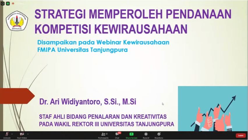 Fakultas Matematika dan Ilmu Pengetahuan Alam Universitas Tanjungpura (FMIPA Untan) selenggarakan Webinar Kewirausahaan untuk menjaring calon wirausaha muda. Acara webinar yang bertemakan "Menyiapkan Entrepreneur di Era Industri 4.0 dan Lokakarya Pendampingan Calon entrepreneur", diselenggarakan secara daring melalui Aplikasi Zoom Meeting dan disiarkan juga secara langsung di Channel Youtube FMIPA UNTAN, Selasa (27/10/2020).