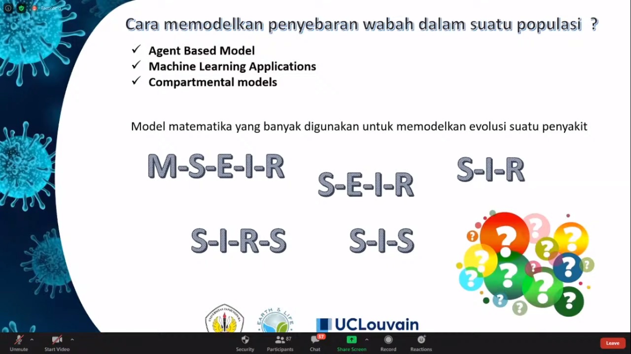 Materi terakhir disampaikan oleh Joko Sampurno, S.Si., M.Si yang juga seorang Ph.D Candidate, tapi dari Universite Catolique de Loavin Belgia. Dosen Fisika FMIPA Untan ini membawakan materi tentanf “ Pemodelan Wabah COVID-19 di Kota Pontianak”