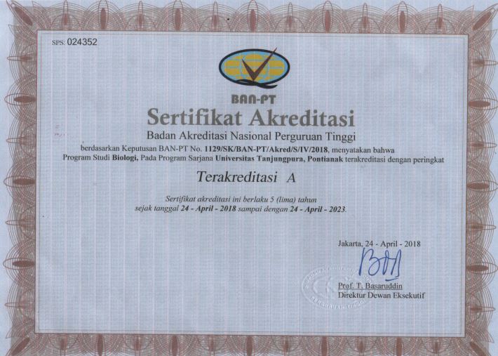 Keberadaan Program Studi Biologi FMIPA UNTAN diharapkan dapat menjadi institusi yang terpadu dan unggul dalam peningkatan sumber daya manusia untuk mengelola sumber daya alam sehingga memberikan dampak terhadap peningkatan kualitas kehidupan. Pendirian Program Studi Biologi berdasarkan Surat Dirjen Dikti Depdiknas Nomor 3494/D/T/2001. Program Studi Biologi berstatus Terakreditasi dengan Peringkat A sesuai dengan SK. BAN-PT Nomor 1129/SK/BAN-PT/Akred/S/IV/2018 berlaku sampai dengan 24 April 2023.