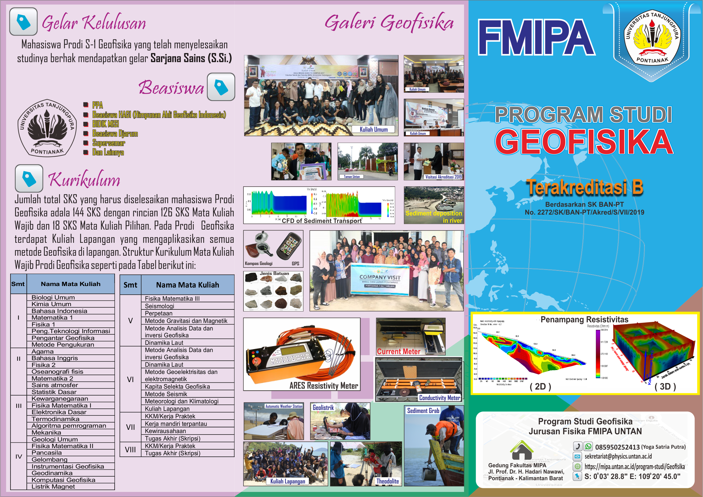 Kalimantan Barat merupakan salah satu provinsi di Indonesia yang memiliki potensi sumber daya alam yang beragam baik yang terkandung di daratan maupun yang terpendam di dasar sungai dan muara (estuari). Selain itu, posisi Kalimantan Barat yang terletak pada jalur khatulistiwa memiliki karakter atmosfer yang khas untuk dikaji secara lebih mendalam. Sumber daya alam sebuah daerah mampu memberikan kontribusi yang besar terhadap peningkatan ekonomi lokal, regional maupun nasional. Dalam skala lokal, pengelolaan sumber daya alam yang menerapkan teknologi berbasis ilmu pengetahuan, dapat berkontribusi terhadap peningkatan kesejahteraan masyarakat, khususnya di Kalimantan Barat. Dalam skala regional, pengelolaan sumber daya alam yang baik dapat memberikan manfaat yang besar bagi masyarakatnya, seperti tersedianya kesempatan kerja, peningkatan pendapatan daerah, pengembangan masyarakat, menciptakan sarana dan prasarana, serta memperkecil kesenjangan antar daerah. Sedangkan pada skala nasional, dapat memberikan kontribusi positif terhadap pendapatan nasional. Oleh karena itu, kajian dan pengembangan teknologi terkait dengan pemanfaatan sumber daya alam di darat dan perairan, serta kondisi khas atmosfer di wilayah khatulistiwa harus terus dilakukan secara kontinyu dan profesional. Program Studi (PS) Geofisika, Jurusan Fisika, FMIPA Untan hadir dalam rangka mengkaji dan mengembangkan ilmu pengetahuan dan teknologi untuk memanfaatkan sumber daya alam Kalimantan Barat melalui penyelenggaraan pendidikan dan pengkajian yang terkait dengan bidang ilmu Geofisika. Upaya yang dilakukan oleh PS Geofisika untuk berkontribusi positif sesuai bidangnya, telah dibuktikan dengan penilaian yang baik dari Badan Akreditasi Nasional Perguruan Tinggi (BAN-PT) yang telah memberikan peringkat B (Baik Sekali) kepada PS Geofisika berdasarkan Keputusan BAN-PT No. 2272/SK/BAN-PT/Akred/S/VII/2019 berlaku sejak 9 Juli 2019 hingga 9 Juli 2024.